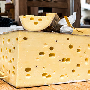 Cheesemakers use a hammer-like tool to “knock” the cheese. The sound emitted tells them the size of the holes and the stage of development.